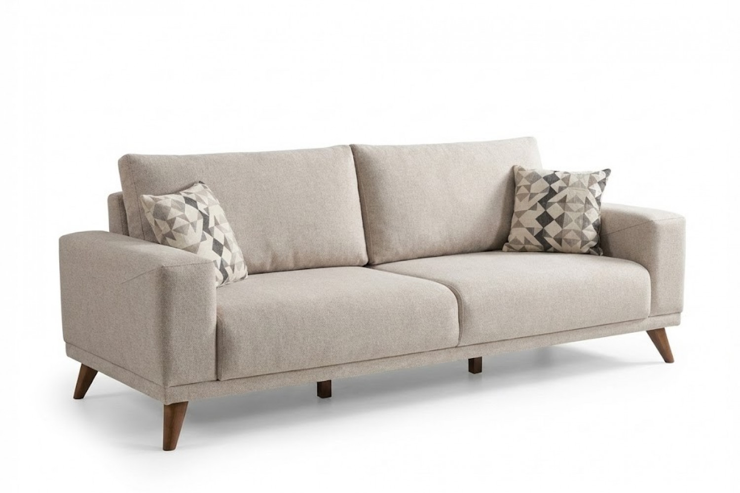 Geometrik Detaylar: Takımla uyumlu geometrik desenli kırlentler, sade tasarıma modern bir hareketlilik kazandırır.